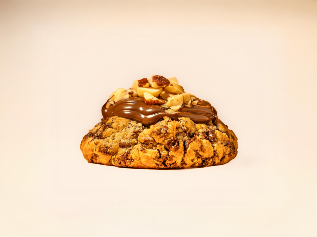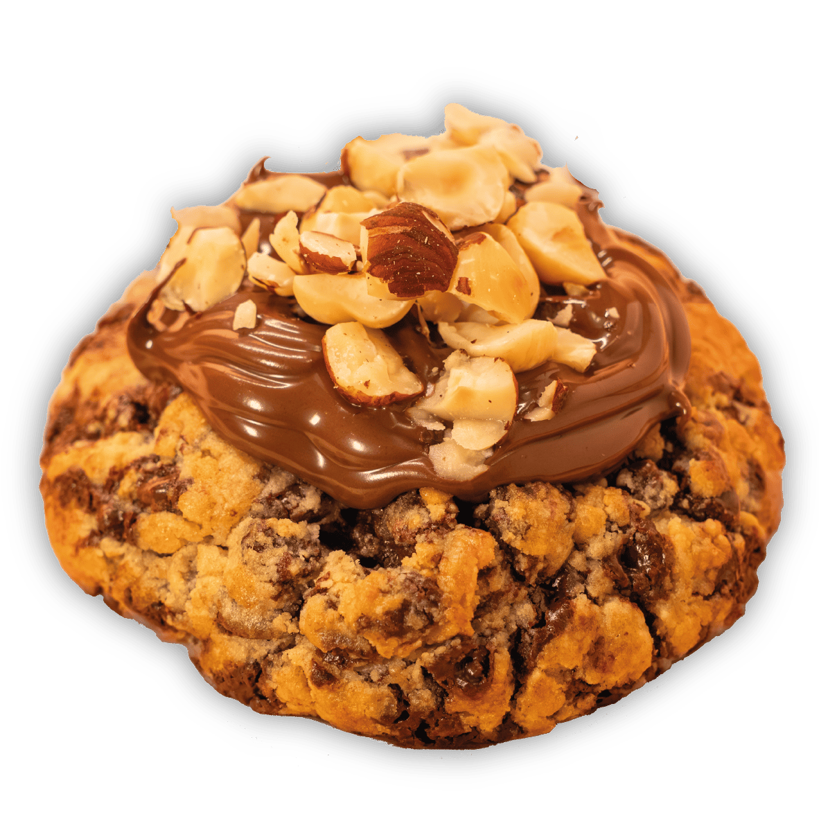 Galleta, pepitas de chocolate, Nutella y avellanas.
